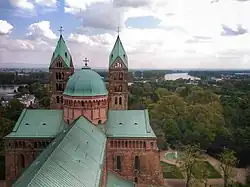 Speyer (German: [ˈʃpaɪɐ] ⓘ, older spelling Speier; Palatine German: Schbaija; French: Spire), historically known in English as Spires, is a city in Rhineland-Palatinate in the western part of the Federal Republic of Germany with approximately 50,000 inhabitants. Located on the left bank of the river Rhine, Speyer lies 25 km (16 miles) south of Ludwigshafen and Mannheim, and 21 km (13 miles) south-west of Heidelberg. Founded by the ancient Romans as a fortified town on the northeast frontiers of their Roman Empire, it is one of Germany's oldest cities. Speyer Cathedral, a number of other churches, and the Altpörtel ("old gate") dominate the Speyer landscape. In the cathedral, beneath the high altar, are the tombs of eight Holy Roman Emperors and German kings.