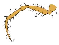 Spiders are chelicerates and therefore, arthropods.[11] As arthropods, they have: segmented bodies with jointed limbs, all covered in a cuticle made of chitin and proteins; heads that are composed of several segments that fuse during the development of the embryo.[12] Being chelicerates, their bodies consist of two tagmata, sets of segments that serve similar functions: the foremost one, called the cephalothorax or prosoma, is a complete fusion of the segments that in an insect would form two separate tagmata, the head and thorax; the rear tagma is called the abdomen or opisthosoma.[11] In spiders, the cephalothorax and abdomen are connected by a small cylindrical section, the pedicel.[13] The pattern of segment fusion that forms chelicerates' heads is unique among arthropods, and what would normally be the first head segment disappears at an early stage of development, so that chelicerates lack the antennae typical of most arthropods. In fact, chelicerates' only appendages ahead of the mouth are a pair of chelicerae, and they lack anything that would function directly as "jaws".[12][14] The first appendages behind the mouth are called pedipalps, and serve different functions within different groups of chelicerates.[11]