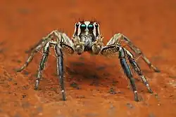 Spiders have primarily four pairs of eyes on the top-front area of the cephalothorax, arranged in patterns that vary from one family to another.[13] The principal pair at the front are of the type called pigment-cup ocelli ("little eyes"), which in most arthropods are only capable of detecting the direction from which light is coming, using the shadow cast by the walls of the cup. However, in spiders these eyes are capable of forming images.[25][26] The other pairs, called secondary eyes, are thought to be derived from the compound eyes of the ancestral chelicerates, but no longer have the separate facets typical of compound eyes. Unlike the principal eyes, in many spiders these secondary eyes detect light reflected from a reflective tapetum lucidum, and wolf spiders can be spotted by torchlight reflected from the tapeta. On the other hand, the secondary eyes of jumping spiders have no tapeta.[13]