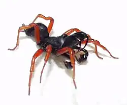 Males of the genus Tidarren amputate one of their palps before maturation and enter adult life with one palp only. The palps are 20% of the male's body mass in this species, and detaching one of the two improves mobility. In the Yemeni species Tidarren argo, the remaining palp is then torn off by the female. The separated palp remains attached to the female's epigynum for about four hours and apparently continues to function independently. In the meantime, the female feeds on the palpless male.[49] In over 60% of cases, the female of the Australian redback spider kills and eats the male after it inserts its second palp into the female's genital opening; in fact, the males co-operate by trying to impale themselves on the females' fangs. Observation shows that most male redbacks never get an opportunity to mate, and the "lucky" ones increase the likely number of offspring by ensuring that the females are well-fed.[50] However, males of most species survive a few matings, limited mainly by their short life spans. Some even live for a while in their mates' webs.[51]