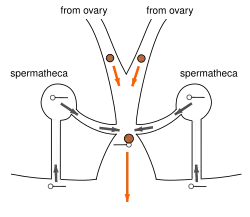 Female spiders' reproductive tracts are arranged in one of two ways. The ancestral arrangement ("haplogyne" or "non-entelegyne") consists of a single genital opening, leading to two seminal receptacles (spermathecae) in which females store sperm. In the more advanced arrangement ("entelegyne"), there are two further openings leading directly to the spermathecae, creating a "flow through" system rather than a "first-in first-out" one. Eggs are as a general rule only fertilized during oviposition when the stored sperm is released from its chamber, rather than in the ovarian cavity.[44] A few exceptions exist, such as Parasteatoda tepidariorum. In these species the female appears to be able to activate the dormant sperm before oviposition, allowing them to migrate to the ovarian cavity where fertilization occurs.[45][46][47] The only known example of direct fertilization between male and female is an Israeli spider, Harpactea sadistica, which has evolved traumatic insemination. In this species the male will penetrate its pedipalps through the female's body wall and inject his sperm directly into her ovaries, where the embryos inside the fertilized eggs will start to develop before being laid.[48]