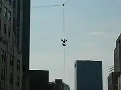 A camera system called the Spydercam was used to allow filmmakers to express more of Spider-Man's world view, at times dropping fifty stories and with shot lengths of just over 2,400 feet (730 m) in New York or 3,200 feet (980 m) in Los Angeles. For some shots the camera would shoot at six frames per second for a faster playback increasing the sense of speed. Shots using the Spydercam were pre-planned in digital versions of cities, and the camera's movement was controlled with motion control, making it highly cost-effective. The camera system was only used in the previous film for the final shot.[33][66]