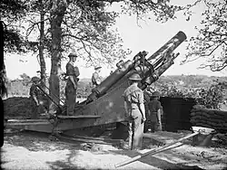During the Second World War, Milligan served as a signaller in D Battery (later 19 Battery), 56th Heavy Regiment, Royal Artillery, as Gunner Milligan, 954024. The unit was equipped with the obsolete First World War era BL 9.2-inch howitzer and based in Bexhill[11] on the south coast of England. Milligan describes training with these guns in part two of Adolf Hitler: My Part in His Downfall, claiming that, during training, gun crews resorted to shouting "bang" in unison as they had no shells with which to practise.[12]