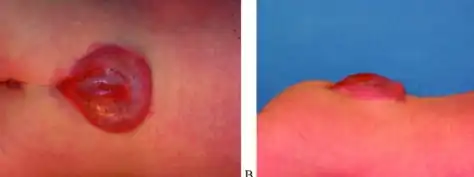 Spina bifida with myelocele is the most severe form of myelomeningocele. In this type, the involved area is represented by a flattened, plate-like mass of nervous tissue with no overlying membrane. The exposure of these nerves and tissues make the baby more prone to life-threatening infections such as meningitis.[33]
