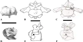 The 2020 study indicates synonymy between Spinosaurus and Sigilmassasaurus, and considered specimens previously referred to Sigilmassasaurus as those of Spinosaurus.[16] For instance, the referral of an isolated quadrate (specimen MHNM.KK376) to Sigilmassasaurus brevicollis, based on its difference from other specimens assigned to Spinosaurus aegyptiacus,[60] was rejected by the 2020 study which noted that these differences in morphology are indicative of variation in skull morphology within a single species.[16] Lakin and Longrich (2019) assigned a juvenile specimen FSAC-KK-18122 to Sigilmassasaurus brevicollis based on its identical proportions to BSPG 2011 I 115, which was assigned to the taxon in a 2015 study, and the presence of a median tubercle and median suture (a rounded growth and joint respectively located on the side of the vertebra).[53][28] However, this referral was also rejected in a 2020 study based on the fact that the median tubercle and median suture is present in BSPG 2011 I 115 but actually absent in FSAC-KK-18122, so the presence or absence of such feature should not be used to taxonomically separate isolated spinosaurid remains.[16] Regardless of the synonymy of Sigilmassasaurus with Spinosaurus, some authors consider the possibility that there could be a second distinct spinosaurid in North Africa during the Cenomanian age based on quadrate, frontal, ilium, and other morphotypes.[61][27][62][16] Additionally, in 2024, a complete posterior cervical vertebra (specimen NHMUK PV R 38358) was assigned to Sigilmassasaurus brevicollis.[58]