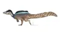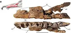 In 2014, Ibrahim and colleagues assigned the fossils to S. aegyptiacus, designated it the neotype (replacement holotype), and stated that all North African Cenomanian spinosaurid material belongs to S. aegyptiacus. The description of these remains were met with intrigue, surprise, and controversy, as the authors claimed that Spinosaurus was a possibly quadrupedal, semiaquatic, short-limbed spinosaurid.[15][42] The body proportions of the specimen have been debated, as the hind limbs are disproportionately shorter in the specimen than in previous reconstructions. However, it has been demonstrated by multiple paleontologists that the specimen is not a chimera, and is indeed a specimen of Spinosaurus that suggests that the animal had much smaller hind limbs than previously thought.[15][45][46][47] In 2015, British paleontologist Serjoscha Evers and colleagues rejected the neotype designation for FSAC-KK-11888 on the basis of the lack of association or locality information for FSAC-KK-11888, the geographical separation between the holotype and FSAC-KK-11888 localities, and anatomical differences between FSAC-KK-11888 and the holotype. Evers and colleagues (2015) argue for the validity of S. marrocanus and S. aegyptiacus, stating that FSAC-KK-11888 is likely from the former. Additionally, the geographical separation of FSAC-KK-11888 and the holotype as well as the detailed description of the holotype by Stromer (1915) are evidence that FSAC-KK-11888 does not meet the ICZN (International Code of Zoological Nomenclature)'s requirements for a neotype and that the creation of a neotype is unnecessary for S. aegyptiacus.[28] Additionally, some paleontologists have suggested that the proportions of the dorsal vertebrae compared to the legs of FSAC-KK-11888 when compared to the proportions of "Spinosaurus B" illustrate that either the former is a composite (a specimen composed of multiple individuals of the same species)/chimera (a specimen composed of material from two or more species) between an individual known from dorsal vertebrae and an individual known from limb, pelvic, and tail material or that FSAC-KK-11888 is not from Spinosaurus.[48][28] Between 2015 and 2019, several additional expeditions to the site unearthed additional fossils of FSAC-KK-11888 including many caudal vertebrae, composing about 80% of the tail, elements of the peses and hindlimbs, skull fragments, and more. Around 90% of this new material was found in late 2018 whereas some fragments, such as the skull fragments, were found in debris of previous expeditions. In 2020, Ibrahim and colleagues described the tail of FSAC-KK-11888, which they stated closely compares to the caudal vertebrae of the holotype and "Spinosaurus B". The material found on these expeditions perfectly matches elements of the FSAC-KK-11888, proving that they come from a single individual.[17]