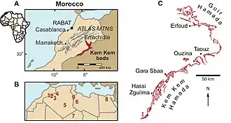 - ^ Ibrahim, Nizar; Varricchio, David J.; Sereno, Paul C.; Wilson, Jeff A.; Dutheil, Didier B.; Martill, David M.; Baidder, Lahssen; Zouhri, Samir (March 6, 2014). "Dinosaur Footprints and Other Ichnofauna from the Cretaceous Kem Kem Beds of Morocco". PLOS ONE. 9 (3) e90751. Bibcode:2014PLoSO...990751I. doi:10.1371/journal.pone.0090751. ISSN 1932-6203. PMC 3946209. PMID 24603467.