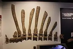 - BSP 1912 VIII 19, described by Stromer in 1915 from the Bahariya Formation, is the holotype of S. aegyptiacus.[6][9] This type specimen (BSP 1912 VIII 19) consisted of: right and left dentaries and splenials from the lower jaw measuring 75 centimeters (30 in) long; a straight piece of the left maxilla that was described but not drawn; 20 teeth; two cervical vertebrae; seven dorsal vertebrae; three sacral vertebrae; one caudal vertebra; four thoracic ribs; and gastralia. Of the nine neural spines whose heights are given, the longest ("i," associated with a dorsal vertebra) was 1.65 meters (5.4 ft) in length.[6][9] This specimen was part of the Paläontologisches Museum München collection, which was destroyed during World War II.[9]