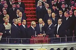 At the convention, held August 5–8, Agnew abandoned his favorite son status, placing Nixon's name in nomination.[83] Nixon narrowly secured the nomination on the first ballot.[84] In the discussions that followed about a running mate, Nixon kept his counsel while various party factions thought they could influence his choice: Strom Thurmond, the senator from South Carolina, told a party meeting that he held a veto on the vice presidency.[85] It was evident that Nixon wanted a centrist, though there was little enthusiasm when he first proposed Agnew, and other possibilities were discussed.[86] Agnew was seen as a candidate who could appeal to Rockefeller Republicans, was acceptable to Southern Conservatives, and had a solid law-and-order record.[87] Some party insiders thought that Nixon had privately settled on Agnew early on, and that the consideration of other candidates was little more than a charade.[88][89] On August 8, after a final meeting of advisers and party leaders, Nixon declared that Agnew was his choice, and shortly afterwards announced his decision to the press.[90] Delegates formally nominated Agnew for the vice presidency later that day, before adjourning.[91]