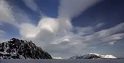 Spitsbergen is the meeting place for cold polar air from the north and mild, wet sea air from the south, creating low pressure and changing weather and fast winds, particularly in winter; in January, a strong breeze is registered 17% of the time at Isfjord Radio, but only 1% of the time in July. In summer, particularly away from land, fog is common, with visibility under 1 kilometre (0.62 mi) registered 20% of the time in July.[72] Precipitation is frequent but falls in small quantities, typically less than 400 millimetres (16 in) annually in western Spitsbergen. More rain falls in the uninhabited east side, where there can be more than 1,000 millimetres (39 in) annually.[72]
