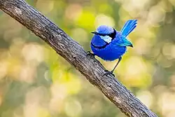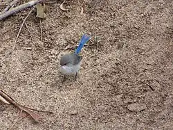 The splendid fairywren is a small, long-tailed bird 14 cm (5.5 in) long. Exhibiting a high degree of sexual dimorphism, the breeding male is distinctive with a bright blue forehead and ear coverts, a violet throat and deeper rich blue back wings, chest and tail with a black bill, eye band and chest band. The blue breeding plumage of the male is often referred to as nuptial plumage. The non-breeding male is brown with blue in the wings and a bluish tail. The female resembles the non-breeding male but has a chestnut bill and eye-patch.[23] Immature males will moult into breeding plumage the first breeding season after hatching, though this may be incomplete with residual brownish plumage and may take another year or two to perfect.[24] Both sexes moult in autumn after breeding, with males assuming an eclipse non-breeding plumage. They will moult again into nuptial plumage in winter or spring.[25] Some older males have remained blue all year, moulting directly from one year's nuptial plumage to the next.[26] Breeding males' blue plumage, particularly the ear-coverts, is highly iridescent due to the flattened and twisted surface of the barbules.[27] The blue plumage also reflects ultraviolet light strongly, and so may be even more prominent to other fairywrens, whose colour vision extends into this part of the spectrum.[28] The call is described as a gushing reel,[23] which is harsher and louder than other fairywrens and varies from individual to individual.[29] A soft single trrt serves as a contact call within a foraging group, while the alarm call is a tsit. Cuckoos and other intruders may be greeted with a threat posture and churring threat.[30] Females emit a purr while brooding.[31]