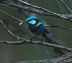 The splendid fairywren is predominantly insectivorous; its diet includes a wide range of small creatures, mostly arthropods such as ants, grasshoppers, crickets, spiders and bugs. This is supplemented by small quantities of seeds, flowers, and fruit.[54] They mostly forage on the ground or in shrubs that are less than two metres above the ground; this has been termed 'hop-searching'. Unusually for fairywrens, they may also occasionally forage in the canopy of flowering gums.[36] Birds tend to stick fairly close to cover and forage in groups as this foraging practice does render them vulnerable to a range of predators. Food can be scarce in winter and ants are an important 'last resort' option, constituting a much higher proportion of the diet.[55] Adult fairywrens feed their young a different diet, conveying larger items such as caterpillars and grasshoppers to nestlings.[56]