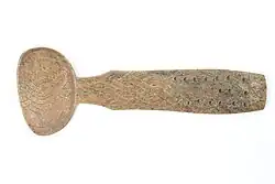 Preserved examples of various forms of spoons used by the ancient Egyptians include those composed of ivory, flint, slate and wood, many of them carved with religious symbols.[5] During the Neolithic Ozieri civilization in Sardinia, ceramic ladles and spoons were already in use. In Shang dynasty China, spoons were made of bone. Early bronze spoons in China were designed with a sharp point, and may have also been used as cutlery.[6] The spoons of the Greeks and Romans were chiefly made of bronze and silver and the handle usually takes the form of a spike or pointed stem.[5] There are many examples in the British Museum from which the forms of the various types can be ascertained, the chief points of difference being found in the junction of the bowl with the handle.[5] The ancient Greeks called the spoon mystron (μύστρον), and they also used pieces of bread scooped out in the shape of a spoon, which they called, mystile (μυστίλη).[7][8]