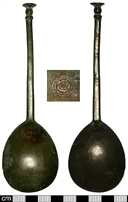 The spoon consists of a bowl and a handle. A handle in the shape of a slender stick is frequently called a stem. The stem can end in a sharp point or be crowned with a knop, a decorative knob.[1] The knop-top spoons with a variety of knop shapes described by colorful terms like "acorn", "writhen-end" (spiral ornament on a ball), "maidenhead" (a bust), "diamond point," "apostle" were particularly popular in England in the 14th to 17th centuries.[2]