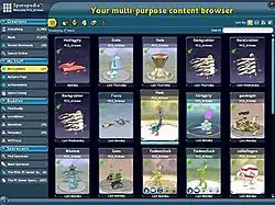 The Sporepedia keeps track of nearly every gameplay experience, including the evolution of a creature by graphically displaying a timeline which shows how the creature incrementally changed over the eons; it also keeps track of the creature's achievements, both noteworthy and dubious, as a species.[9] The Sporepedia also keeps track of all the creatures, planets, vehicles and other content the player encounters over the course of a game. Players can upload their creations to Spore.com to be viewed by the public at the Sporepedia website. As of May 2009, the list of creations has surpassed 100 million items.[26]