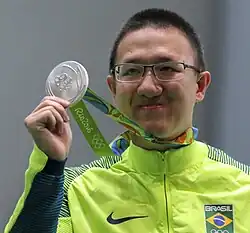 Judo is another sport usually recommended for children in Brazil, and therefore it is widely practiced. The country has a growing international tradition in the sport, constantly winning medals and titles. The sport was brought and developed by its large Japanese community. The greatest exponents of the sport until today were Aurélio Miguel, Sarah Menezes and Rogério Sampaio, Olympic champions. Brazil also had several other important judo athletes, such as the Olympic runners-up Douglas Vieira, Tiago Camilo, Carlos Honorato, Willian Lima, and the Olympic bronze medalists Chiaki Ishii, Luiz Onmura, Walter Carmona, Henrique Guimarães, Leandro Guilheiro, Flávio Canto, Ketleyn Quadros, Felipe Kitadai, Mayra Aguiar, Daniel Cargnin, Rafael Silva and Larissa Pimenta.[30][31][32] Brazil also had world champion judokas, such as João Derly, who forced changes to the rules of world judo due to their dominance.[33]