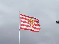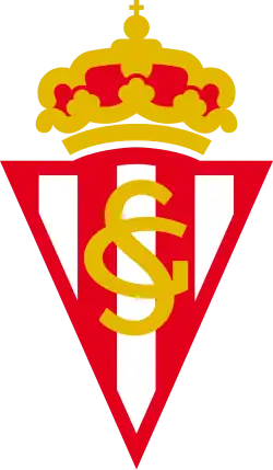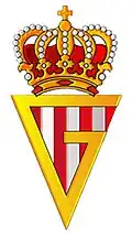 The club's badge is a triangle with red and white vertical stripes with 'S' (for Sporting) and 'G' (for Gijón) intertwined, in gold, across them. A crown in the top symbolizes the royal patronage.[19]