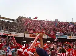 Sporting de Gijón supporters commonly call themselves Sportinguistas in order to show their dedication to the club.[23] Sportinguistas are widely regarded as one of the most loyal, best travelling, and most cheerful supporter groups in La Liga,[24][25][26] providing one of the best atmospheres in the competition.[27] When following their team in large groups through the country, they are referred to as La Mareona, Spanish for The Big Tide, composed mainly by 240 groups of supporters or peñas.[28]