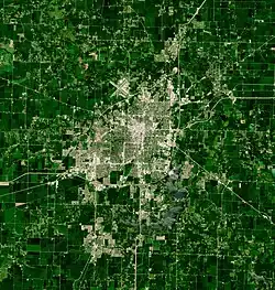 The city is at an elevation of 558 feet (170 m) above sea level.[2] According to the 2010 census, Springfield has a total area of 65.764 square miles (170.33 km2), of which 59.48 square miles (154.05 km2) (or 90.44%) is land and 6.284 square miles (16.28 km2) (or 9.56%) is water.[31] The city is located in the Lower Illinois River Basin, in a large area known as Till Plain. Sangamon County, and the city of Springfield, are in the Springfield Plain subsection of Till Plain. The Plain is underlain by glacial till that was deposited by a large continental ice sheet that repeatedly covered the area during the Illinoian Stage.[32][33]