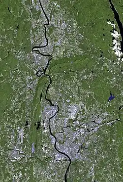 Located in the fertile Connecticut River Valley, surrounded by mountains, bluffs, and rolling hills in all cardinal directions, Springfield sits on the eastern bank of the Connecticut River, near its confluence with two major tributary rivers—the western Westfield River, which flows into the Connecticut opposite Springfield's South End Bridge; and the eastern Chicopee River, which flows into the Connecticut less than 0.5 mi (0.8 km) north of Springfield, in the city of Chicopee (which constituted one of Springfield's most populous neighborhoods until it separated and became an independent municipality in 1852).[39] The Connecticut state line is only 4 miles (6 km) south of Springfield, beside the wealthy suburb of Longmeadow, which itself separated from Springfield in 1783.[39]