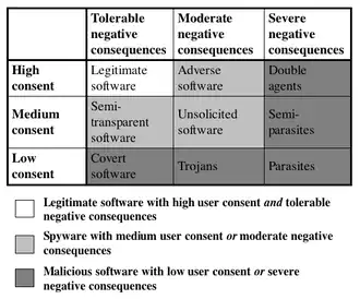 The work by Warkentiens et al. (described in Section 7.3.1 in (Boldt 2007a)) can be used as a starting point when developing a classification of privacy-invasive software, where privacy-invasive software is classified as a combination between user consent and direct negative consequences. User consent is specified as either low, medium or high, while the degree of direct negative consequences span between tolerable, moderate, and severe. This classification allows developers and users to first make a distinction between legitimate software and spyware, and secondly between spyware and malicious software. All software that has a low user consent, or which impairs severe direct negative consequences should be regarded as malware. While, on the other hand, any software that has high user consent, and which results in tolerable direct negative consequences should be regarded as legitimate software. Under this classification system, spyware constitutes the remaining group of software, i.e. those that have medium user consent, or which impair moderate direct negative consequences. This classification is described in further detail in Chapter 7 in (Boldt 2007a).