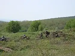 A Romanian squad of a TAB-77 APC in 2010. This is a typical Soviet arrangement, with a PK general purpose machine gun and a RPK light machine gun in the center and two soldiers with AK-47 assault rifles and one RPG-7 grenade launcher on the flanks. Another soldier provides liaison or extra firepower where needed.