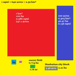 The square mile (abbreviated as sq mi and sometimes as mi2)[1] is an imperial and US unit of measure for area. One square mile is equal to the area of a square with each side measuring a length of one mile.[2]