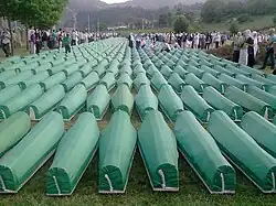Some of the gravestones for the nearly 7,000 identified victims buried at the Srebrenica-Potočari Memorial and Cemetery for the Victims of the 1995 genocide.[1]