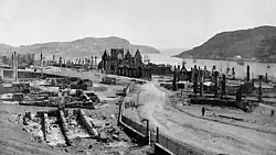 During the Second World War, the harbour supported Royal Navy and Royal Canadian Navy ships that were engaged in anti-submarine warfare. It was the site of an American Army Air Force base, Fort Pepperrell, that was established as part of the "Lend-Lease" Destroyers for Bases Agreement between the United Kingdom and United States.[10] The base included several US-manned coast defence guns, and a Canadian-manned battery of two Lend-Lease 10-inch (250 mm) M1888 guns was at Fort Cape Spear.[37][38] The base was transferred to Canadian control in 1960 and is now known as CFS St. John's. The Knights of Columbus Hostel fire in December 1942 saw 99 military and civilian lives lost.[39]