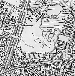 St. Andrew's [Church] was erected in 1846, the fifth and last to be built by the Church Building Society. It was an unsuitable site, and for many years after its building, the only dwellings nearby were huts where brickworkers lived, a few cottages, and an occasional gipsy camp.