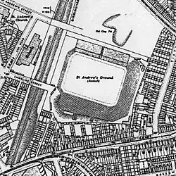 - ^ a b At the very bottom centre of the 1883 map linked here, Muntz Street leaves the Coventry Road heading north-east, crossed by Wright Street. Gessey's field is on the south-eastern side of Muntz St, adjacent to the north-eastern side of the short part of Wright St, and with open country to the other two sides. At the centre left of the map, above the words "Small Heath", and bounded by Coventry Road, Cattell Road, Kelynge Street (since renamed Tilton Road), Garrison Lane and the railway, is the site of the future St Andrew's stadium. Lower down, parallel to and very near the left edge of the map, is Arthur Street, where Small Heath Alliance first played their matches.[10]