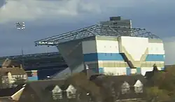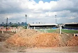 Though relegation to the Third Division meant the club was no longer bound by the Taylor Report's 1994 deadline for conversion to all-seater,[37] new owner David Sullivan continued the £4.5 million development as planned.[23] After the last home game of the 1993–94 season, the Kop and Tilton Road terraces were demolished, helped by fans who took home a significant proportion as souvenirs,[35] the land was cleared – the rubbish tip beneath the Kop which had earned the club £800 in 1906 (£43,300 at 1994 prices)[15] cost £250,000 to decontaminate[38] – and by the start of the new season, 7,000 seats in the Tilton Road Stand were ready for use.[23] On completion of the Kop Stand, the stadium was formally re-opened in November 1994 by Baroness Trumpington, representing the Department of National Heritage, who unveiled a commemorative plaque and presented a cheque for £2.5 million on behalf of the Football Trust; the ceremony was followed by a friendly match against Aston Villa, attended by a crowd of 20,000.[23] Planning permission for an all-seater Railway Stand was granted in March 1995,[39] but work was delayed by a dispute over land owned by Railtrack and the stand opened only in 1999.[40]