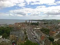 The establishment of the present town began around 1140 by Bishop Robert on an L-shaped hill, possibly on the site of the ruined St Andrews Castle.[26] According to a charter of 1170, the new burgh was built to the west of the Cathedral precinct, along Castle Street and possibly as far as what is now known as North Street.[22] This means that the lay-out may have led to the creation of two new streets (North Street and South Street) from the foundations of the new St Andrews Cathedral filling the area inside a two-sided triangle at its apex.[22] The northern boundary of the burgh was the southern side of the Scores (the street between North Street and the sea) with the southern by the Kinness Burn and the western by the West Port.[27] The burgh of St Andrews was first represented at the great council at Scone Palace in 1357.[27]