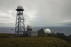 Although 64 kilometres (35 nmi) from the nearest land, St Kilda is visible from as far as the summit ridges of the Skye Cuillin, some 129 kilometres (70 nmi) distant.[41] The climate is oceanic with high rainfall, 1,400 millimetres (55 in), and high humidity. Temperatures are generally cool, averaging 5.6 °C (42.1 °F) in January and 11.8 °C (53.2 °F) in July. The prevailing winds, especially strong in winter, are southerly and southwesterly. Wind speeds average 13 km/h (7.0 kn) approximately 85 percent of the time and more than 24 km/h (13 kn) more than 30 percent of the time. Gale-force winds occur less than two percent of the time, but gusts of 185 km/h (100 kn) and more occur regularly on the high tops, and speeds of 209 km/h (113 kn) have occasionally been recorded near sea level.[42] The tidal range is 2.9 metres (9+1⁄2 ft), and ocean swells of 5 metres (16 ft) frequently occur, which can make landings difficult or impossible at any time of year.[5][43] The oceanic location protects the islands from snow, which lies for only about a dozen days per year.[42]