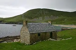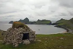 A cleit is a stone storage hut or bothy unique to St Kilda; there are known to be 1,260 cleitean on Hirta and a further 170 on the other group islands.[13] Two different early sheep types have survived on these remote islands: the Soay, a Neolithic type, and the Boreray, an Iron Age type. The islands are a breeding ground for many important seabird species including northern gannets, Atlantic puffins, and northern fulmars. The St Kilda wren and St Kilda field mouse are endemic subspecies.[4]