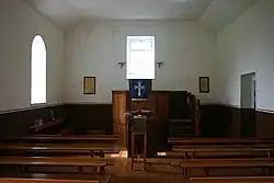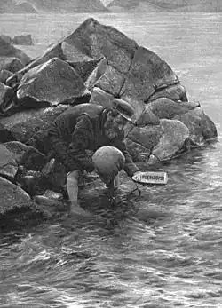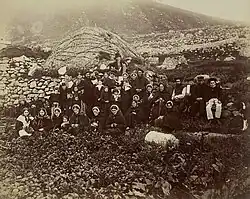 Visiting ships brought cholera and smallpox in the 18th century.[4] In 1727, the loss of life was so high that too few residents remained to man the boats, and new families were brought in from Harris to replace them.[note 8] By 1758 the population had risen to 88, and it had reached just under 100 by the end of the century. This figure remained fairly constant from the 18th century until 1852, when 36 islanders, with the help of the Highland and Island Emigration Society, emigrated to Australia on board the Priscilla; reducing the population to 70.[59] Among the emigrants was Ewen Gillies. The laird of St Kilda, Sir John MacLeod, tried to persuade some of the group to return to the island; when they were unconvinced, he paid for their voyage to Australia.[59] Eighteen of the 36 St Kildans died of sickness on the ship or in quarantine.[59][60][61] The island never fully recovered from the population loss. The emigration was in part a response to the laird's closure of the church and manse for several years during the Disruption that created the Free Church of Scotland.[62][63]