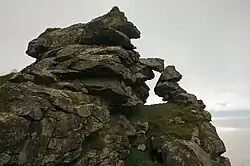 The highest point in the archipelago, Conachair ("the beacon") at 430 metres (1,410 ft), is on Hirta, immediately north of the village. In the southeast is Oiseval ("east fell"), which reaches 290 metres (950 ft), and Mullach Mòr ("big hill summit") 361 metres (1,185 ft) is due west of Conachair. Ruival ("red fell") 137 metres (449 ft) and Mullach Bi ("pillar summit") 358 metres (1,175 ft) dominate the western cliffs. Boreray reaches 384 metres (1,260 ft) and Soay 378 metres (1,240 ft).[4] The extraordinary Stac an Armin reaches 196 metres (643 ft), and Stac Lee, 172 metres (564 ft), making them the highest sea stacks in Britain.[34][35]