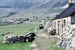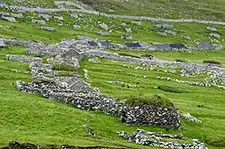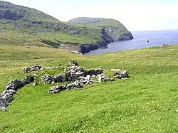 In modern times, St Kilda's only settlement was at Village Bay (Scottish Gaelic: Bàgh a' Bhaile or Loch Hiort) on the east side of Hirta. Gleann Mòr on the north coast of Hirta and Boreray also contain the remains of earlier habitations.[36] The sea approach to Hirta into Village Bay suggests a small settlement flanked by high rolling hills in a semicircle behind it. This is misleading.[37] The whole north face of Conachair is a vertical cliff up to 427 metres (1,401 ft) high,[38] falling sheer into the sea and constituting the highest sea cliff in the UK.[39]