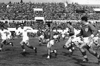 In September 1995 the Olimpico hosted the opening and closing ceremonies of the First Military World Games and the games' track-and-field events.[97] It hosted the Italian rugby union team later that year for the third time (and the first since 1986), against world champions South Africa. In addition to the 1954 European Cup final, Italy played at the Olimpico in 1986, when the team drew 15–15 against England XV in front of 40,000 spectators.[98] Although the Stadio Flaminio was their usual venue in Rome, Italy played at the Olimpico because the match was a fundraiser for children's aid organizations which wanted a larger stadium.[99] South Africa won their first match after their World Cup victory 40–21, after Italy led 21–17 with 15 minutes left.[100] Attendance was about 40,000, and ticket prices were between 5,000 and 30,000 lire (€2.5–15).[99]