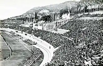 Since the regime intended to apply to host the 1940 Summer Olympics,[13] starting from 1933 the Stadio dei Cipressi was extended. This was completed by architects Luigi Moretti, Angelo Frisa and Achille Pintonello,[14] who designed a concrete structure[14] which hosted a main football pitch and secondary pitches for basketball and weightlifting.[15] The expanded stadium was opened on 9 May 1937, the first anniversary of the Italian Empire. While the capacity of the stadium was less than 60,000, there were plans to raise it to 100,000.[15] After the absorption of the ONB by the National Fascist Party's youth branch, the Gioventù Italiana del Littorio (GIL), the GIL became the owner of the stadium and the rest of the sports complex.[16]