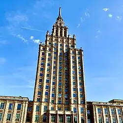 The Stalin's high-rises (Сталинские высотки) are a series of seven high-rise buildings constructed in Moscow between 1947 and 1957, representing the culmination of Stalinist architecture. Designed at the initiative of Joseph Stalin to commemorate Moscow's 800th anniversary, the complex includes the Main Building of Moscow State University, residential buildings on Kotelnicheskaya Embankment and Kudrinskaya Square, the buildings of the Ministry of Foreign Affairs and the Ministry of Transport Construction, as well as the Ukraina and Leningradskaya hotels. The buildings' architectural design draws on a synthesis of neoclassical and American Art Deco, characterized by a stepped silhouette crowned with tall spires bearing Soviet symbols. The project required the implementation of engineering technologies unique to the USSR, including the use of steel frames and artificial ground freezing, which allowed for the creation of a new vertical silhouette for Moscow and the creation of an image of a global "socialist metropolis."