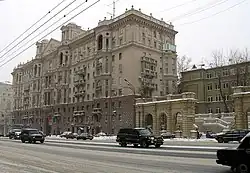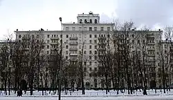 Residential construction in post-war cities was segregated according to the ranks of tenants. No effort was made to conceal luxuries; sometimes they were evident, sometimes deliberately exaggerated (in contrast with Iofan's plain House on Embankment). Country residencies of Stalin's officials was on the top level; so was the 1945 House of Lions by Ivan Zholtovsky (House of Lions was designed by Nikolai Gaigarov and M.M. Dzisko of Zholtovsky Workshop. Zholtovsky supervised and promoted the project), a luxurious downtown residence for Red Army Marshals. 1947 Marshals Apartments by Lev Rudnev, on the same block, has a less extravagant exterior package. There was a type of building for every rank of Stalin's hierarchy.[19]