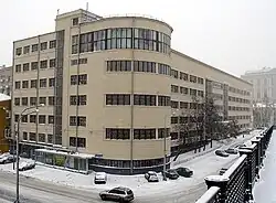 For a brief time in the mid-1920s, the architectural profession operated in the old-fashioned manner, with private companies, international contests, competitive bidding and disputes in professional magazines. Foreign architects were welcomed, especially towards the end of this period, when the Great Depression reduced their jobs at home. Among these were Ernst May, Albert Kahn, Le Corbusier, Bruno Taut and Mart Stam.[8] The difference between traditionalists and constructivists was not well defined. Zholtovsky and Shchusev hired modernists as junior partners for their projects,[9] and at the same time incorporated constructivist novelties in their own designs.[10] In 1930 Gosproektstroi was established as part of the Building Commission of Vesenkha with the help of Albert Kahn Inc. It employed 3,000 designers with a budget of 417 million Rbls.