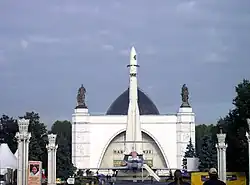 Present-day Cosmos pavilion is one of 1939 originals, remodeled during the 1950s. The rocket shape replaced Stalin's figure (of about the same size).[17]