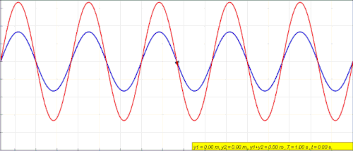 Animation of a standing wave (red) created by the superposition of a left traveling (blue) and right traveling (green) wave
