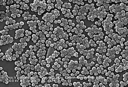 | Scanning electron micrograph of S. aureus; false color added | |