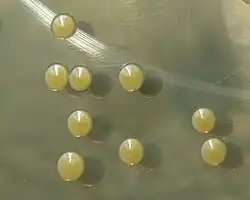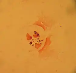 Staphylococcus aureus (/ˌstæfɪləˈkɒkəs ˈɔːriəs, -loʊ-/,[16][17] Greek σταφυλόκοκκος 'grape-cluster berry', Latin aureus, 'golden') is a facultative anaerobic, Gram-positive coccal (round) bacterium also known as "golden staph" and "oro staphira". S. aureus is nonmotile and does not form spores.[18] In medical literature, the bacterium is often referred to as S. aureus, Staph aureus or Staph a..[19] S. aureus appears as staphylococci (grape-like clusters) when viewed through a microscope, and has large, round, golden-yellow colonies, often with hemolysis, when grown on blood agar plates.[20] S. aureus reproduces asexually by binary fission. Complete separation of the daughter cells is mediated by S. aureus autolysin, and in its absence or targeted inhibition, the daughter cells remain attached to one another and appear as clusters.[21]