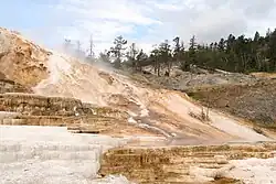 The planet Vulcan setting was created using a mixture of on-location photography at Minerva Hot Springs in Yellowstone National Park and set recreation.[14]: 165 Yellowstone was selected after filming in Turkish ruins proved to be too expensive. Securing permission for filming the scenes was difficult in the middle of the summer tourist season, but the Parks Department acquiesced so long as the crew remained on the boardwalks to prevent damage to geological formations. Zuberano, who had helped select the site for the shoot, traveled to Yellowstone and returned with a number of photos. Minor also made a trip and returned to create a large painting depicting how the scene might look. In consultations with Michelson, the crew decided to use miniatures in the foreground to create the Vulcan temples, combined with the real hot springs in the background. In the film, the bottom third of the frames were composed of miniature stairs, rocks, bits of red glass and a Vulcan statue. The center of the frame contained Nimoy's shots and the park setting, while the final third of the frame was filled with a matte painting. On August 8, the day after production began at Paramount, an 11-person second unit left for Yellowstone. The sequence took three days to shoot.[14]: 172–6