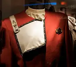 Designer Robert Fletcher was brought in to redesign existing costumes and create new ones. Fletcher decided on a scheme of "corrupt colors", using materials with colors slightly off from the pure color. "They're not colors you see today, so in a subtle way [they] indicate another time."[21] Meyer did not like the Starfleet uniforms from either the television series or The Motion Picture and wanted them changed,[27] but could not be discarded entirely because of the budget. Dye tests of the fabric showed that the old uniforms took three colors well: blue-gray, gold, and dark red. Fletcher decided to use the dark red due to the strong contrast it provided with the background. The resulting naval-inspired designs would be used in Star Trek films until First Contact (1996). The first versions of the uniforms had stiff black collars, but Sallin suggested changing it to a turtleneck, using a form of vertical quilting called trapunto. The method creates a bas-relief effect to the material by stuffing the outlined areas with soft thread shot via air pressure through a hollow needle.[21] By the time of The Wrath of Khan's production, the machines and needles needed to produce trapunto were rare, and Fletcher was only able to find one needle for the wardrobe department.[20] The crew was so worried about losing or breaking the needle that one of the department's workers took it home with him as a security measure, leading Fletcher to think it had been stolen.[21]