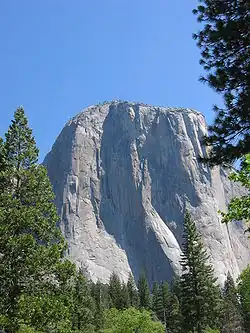 The film's Yosemite scenes were all shot on location.[4] Long shots of Kirk scaling the mountain were filmed with stunt doubles, while Shatner's closer shots had him on a fiberglass set positioned in front of the camera, with the real mountains visible in the background.[58] Aided by two trainers, Shatner had spent weeks at the Paramount lot, learning to climb a wooden replica.[59] Laszlo scouted out a tall peak on which the production created a rock face with safety net. The overhead shot gave the impression Kirk was climbing at a great height, while unnatural background features such as swimming pools were camouflaged. In the scene, Spock watches Kirk's ascent, levitates up behind him as a pest giving suggestions with the outcome that Kirk slips and Spock saves him using levitating boots.[58] Most of the shots framed Nimoy from the waist up; in these scenes the actor was supported by a crane that gave the appropriate "float" to achieve the effect. Bluescreen footage of Shatner falling was shot later at Paramount and composited, while stuntman Ken Bates set a record for the highest American descender fall by plummeting off El Capitan—with a wire support rig—for long shots.[60] In reviewing the dailies of the first two days of shooting, the production realized that a pine tree in the frame during Kirk and Spock's mountain dialogue ruined the illusion of height, while a shot of Shatner clinging to the face of El Capitan appeared muddy due to clouds obscuring the sun and ruining the depth of field. The scenes had to be reshot later.[61]